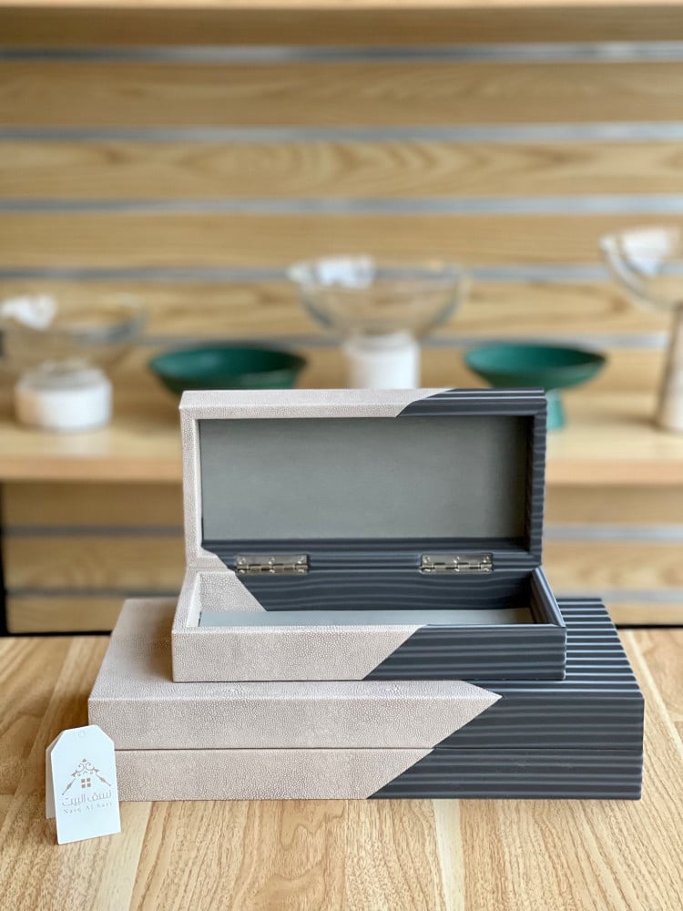 طقم مكون من صندوقين ديكور، مغلفين بالجلد ومزينين بمزيج راقٍ من اللونين الرمادي والبيج. هذا الطقم يجمع بين الأناقة والعملية، مما يجعله مثاليًا لإضافة لمسة جمالية وتنظيمية لأي مساحة. يمنح اللونان الرمادي والبيج الصندوقين مظهرًا عصريًا يتماشى مع مختلف أنماط الديكور.